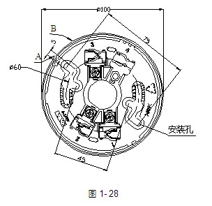 探测器安装接线盒可采用86H50型标准预埋盒,安装采用DZX-02定位底座,其示意图如图1-28: