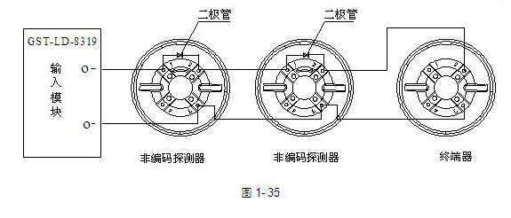 GST-LD-8319输入模块与非编码探测器串联连接时,探测器的底座上应接二极管1N5819,且输出回路终端必须接GST-LD-8320或GST-LD-8320A终端器,终端器可当探测器底座使用,即在此终端器上可安装非编码探测器,其系统构成图如图1-34: