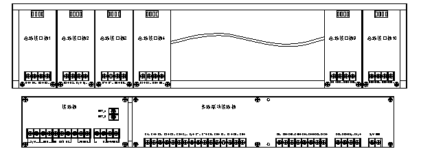 S1+、S1-,S2+、S2-,……S20+、S20-分别对应1~20回路两总线的正、负端子,用于连接探测器、手动报警按钮、输入输出模块等系统部件,每块回路板对应1块总线接口板。